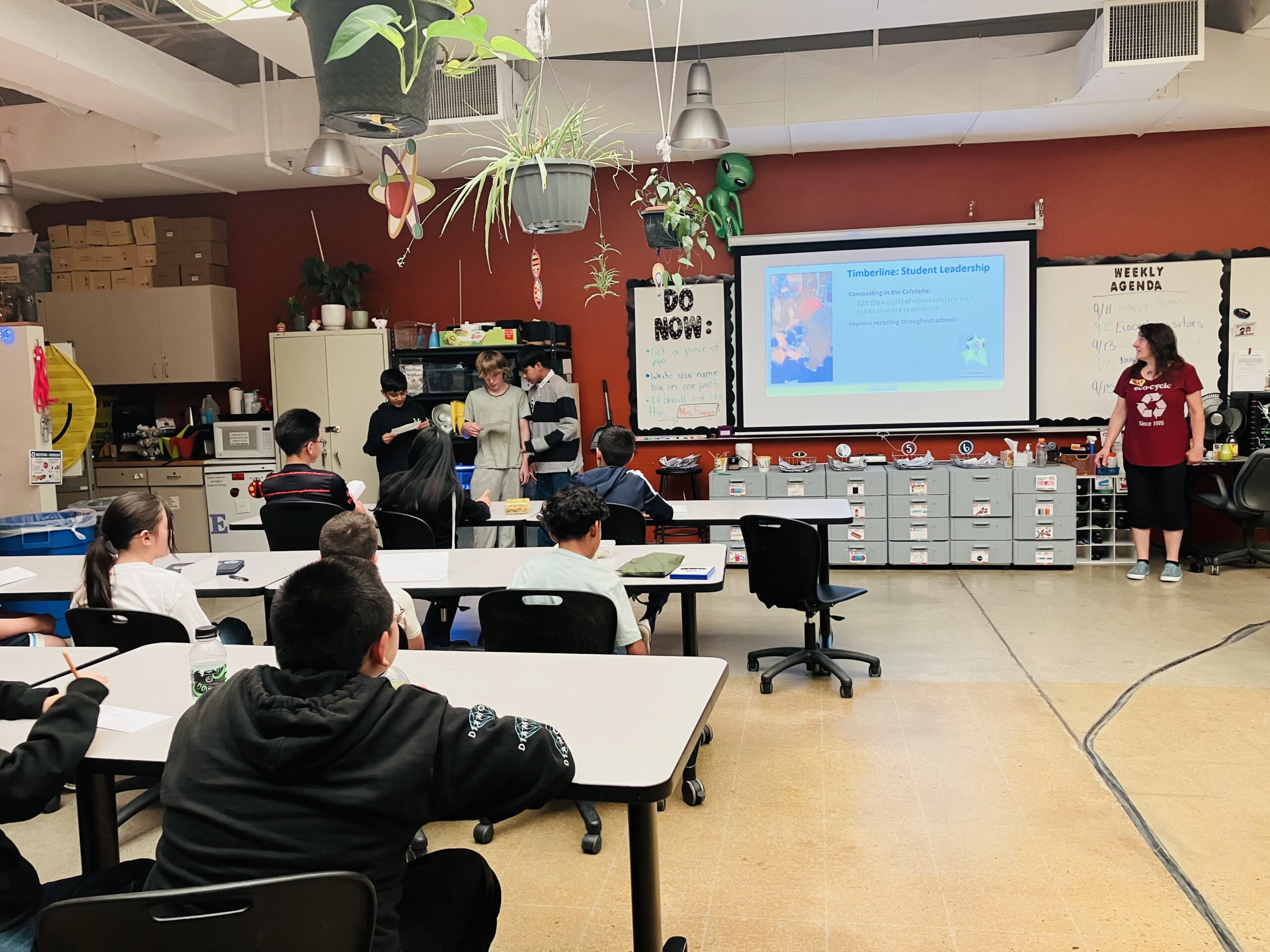 Representatives from EcoCycle have joined students during several of their lunch periods to guide them in recycling, composting, and landfill practices. Timberline is recycling and composting in both of their cafeterias, which gives students a better understanding where their trash goes, and students are also more mindful about sorting their waste during lunch.